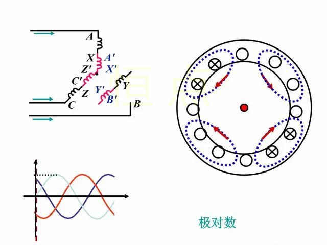 如果A、B、C三相繞組每相分别由兩個線圈串聯組成,每個線圈的跨距爲1/4圓周,那麽三相電流所建立的合成磁場仍然是一個旋轉磁場,並(bìng)且電流變(biàn)化一次,旋轉磁場僅轉過1/2轉,這就是2對極。同理,如果将繞組按一定的規則排列,可得3對極 、4對極或一般地說P對極。P就是極對數。