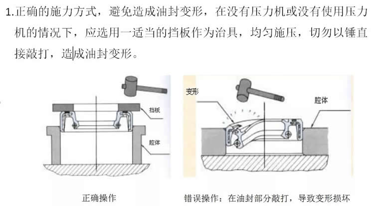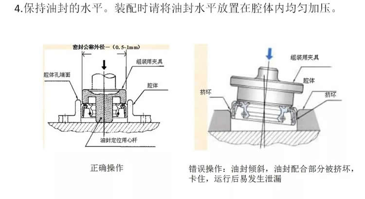 2.油封要平裝,不能有傾斜的現象。建議採(cǎi)用油壓設備(bèi)或套筒工具安裝 。壓力不要太大,速度要均勻、要慢。