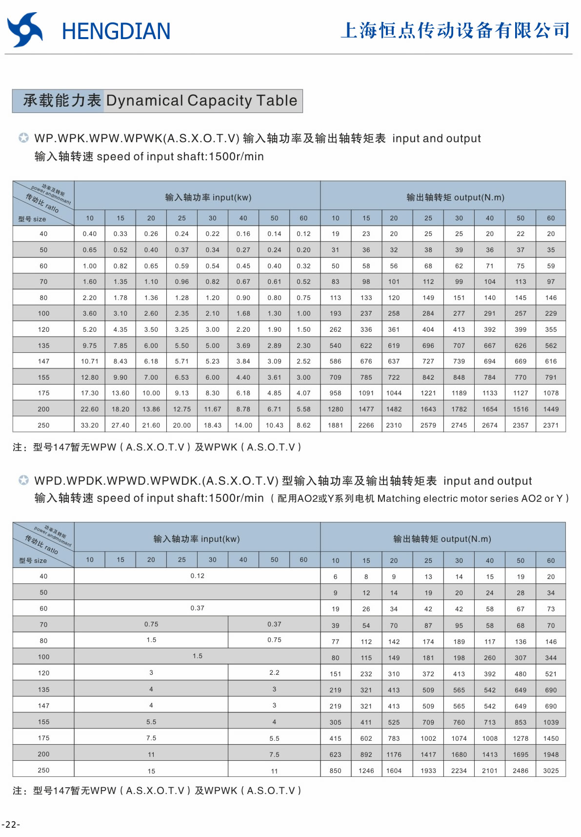 WP鑄鐵蝸輪蝸杆減速機,配置方式靈活,具有一定的自鎖能力,能适應多種安裝和使用的要求,因此使用範圍廣泛。但蝸輪蝸杆減速機本身的傳動效率不高,不如行星減速機或者齒輪減速機,所以在選用時要多方考慮。下面恒點減速機把這類減速機的承載能力表公布下,以便大家查閱: