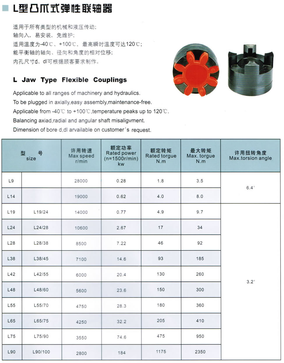 L型凸爪式彈性聯軸器适用於所有類型的機械和液壓傳動;軸向入,易安裝 ,免維 護;适用溫度爲-40度,+100度,最高瞬時溫度可達120度; 能平衡軸的軸向,徑向和角度的相對位移;内孔尺寸d,d1可 根據顧客要求制作。
