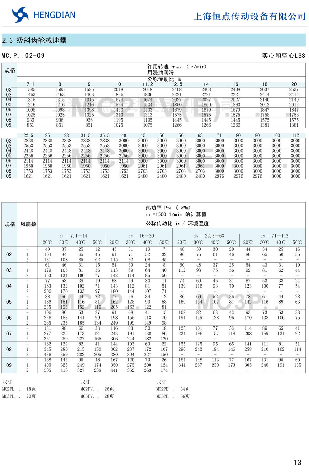 9 - 傳動能力和外型安裝尺寸/斜齒豎立安裝 10 - 傳動能力和外型安裝尺寸/錐齒-斜齒水平安裝
