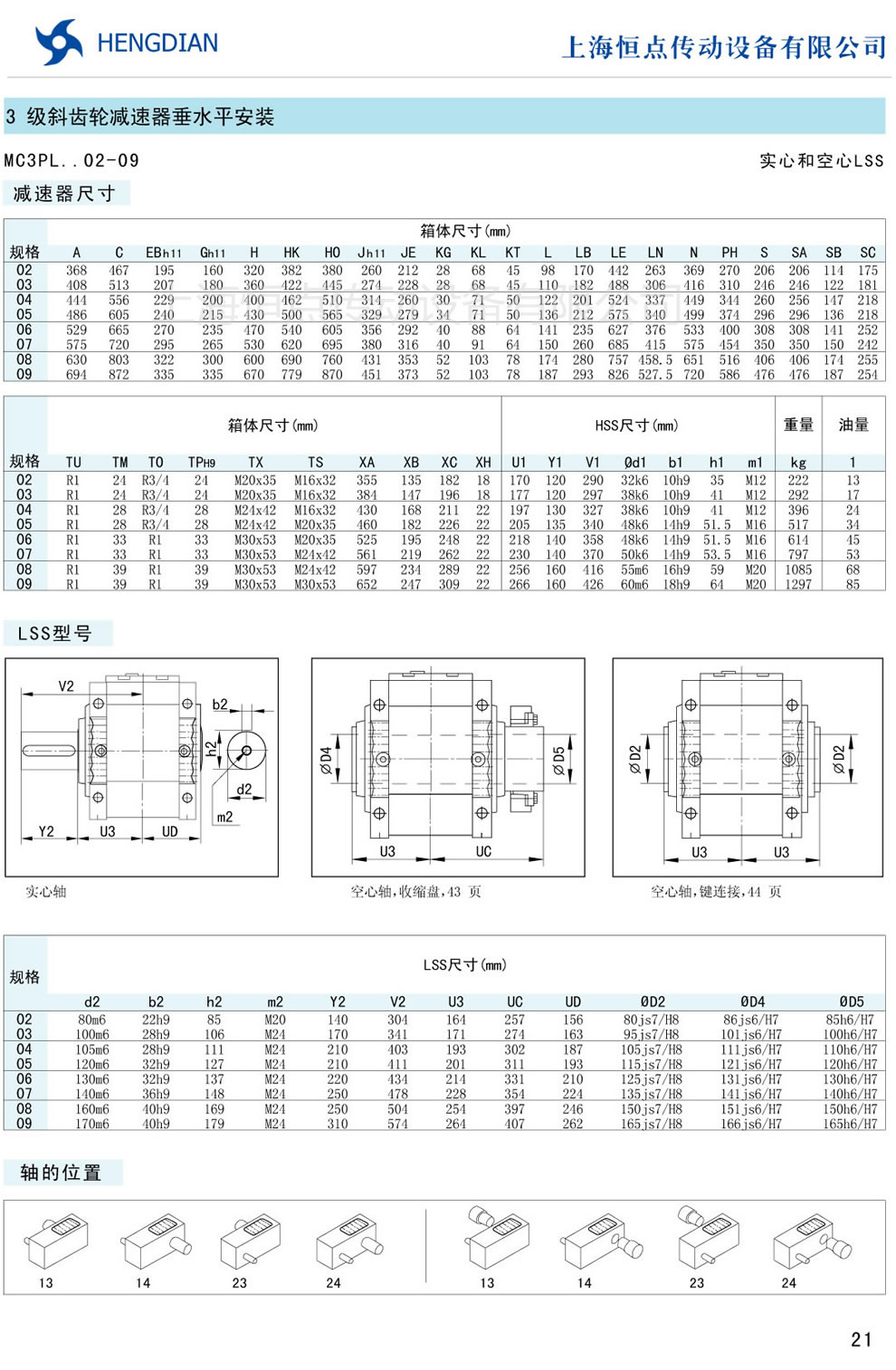 9 - 傳動能力和外型安裝尺寸/斜齒豎立安裝 10 - 傳動能力和外型安裝尺寸/錐齒-斜齒水平安裝