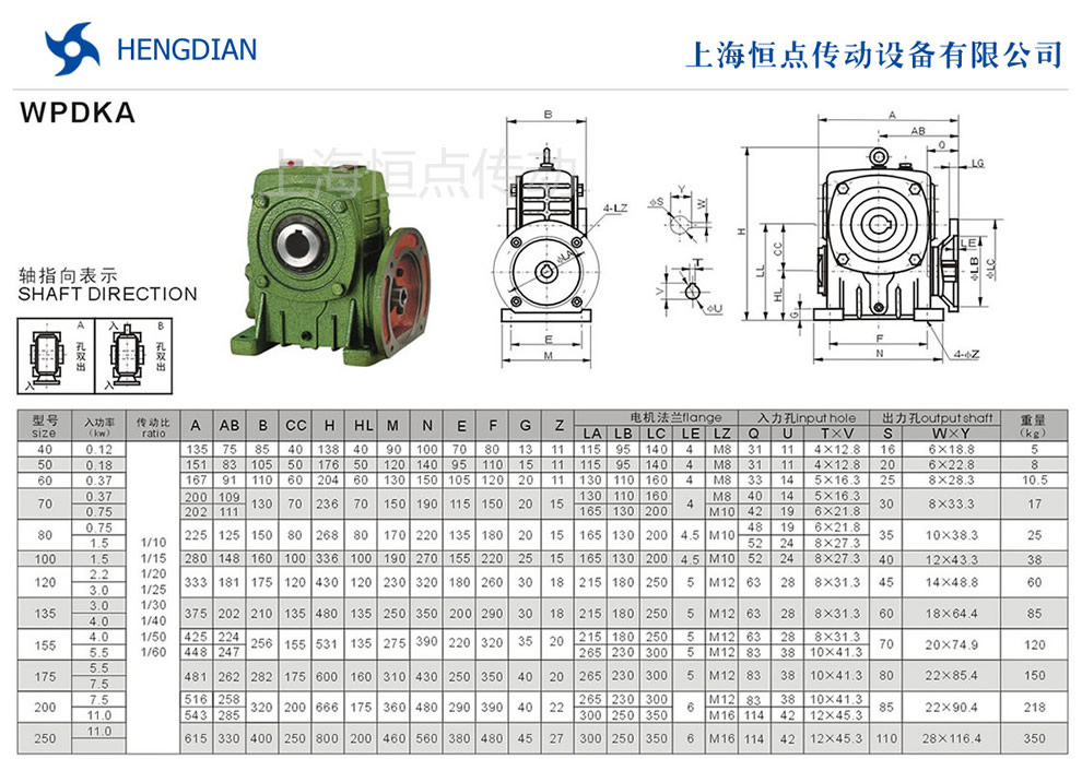 的外形尺寸及安裝尺寸,WPDKA減速機軸指向表示方法.WPDKA減速機法蘭輸入,孔輸出,機座号從40到250,可選速比從10到60.WPDKA系列蝸輪蝸杆減速機選型指南,選型方法
